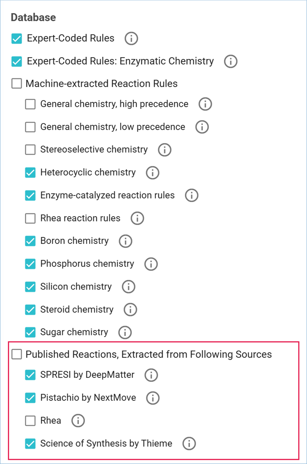 • Published Reaction Databases: SPRESI, Pistachio, and Science of Synthesis.