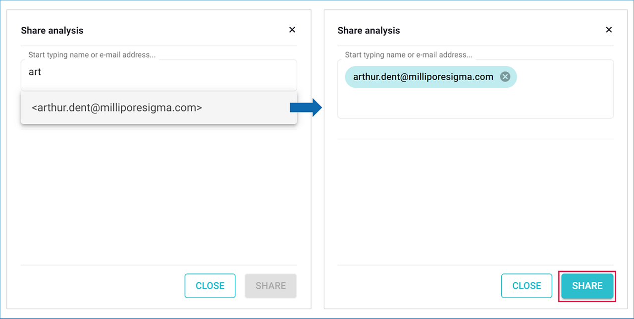 Start typing the email address of the colleague you want to share the analysis with. SYNTHIA™ will automatically show matching names of people in your organization who also have an account.