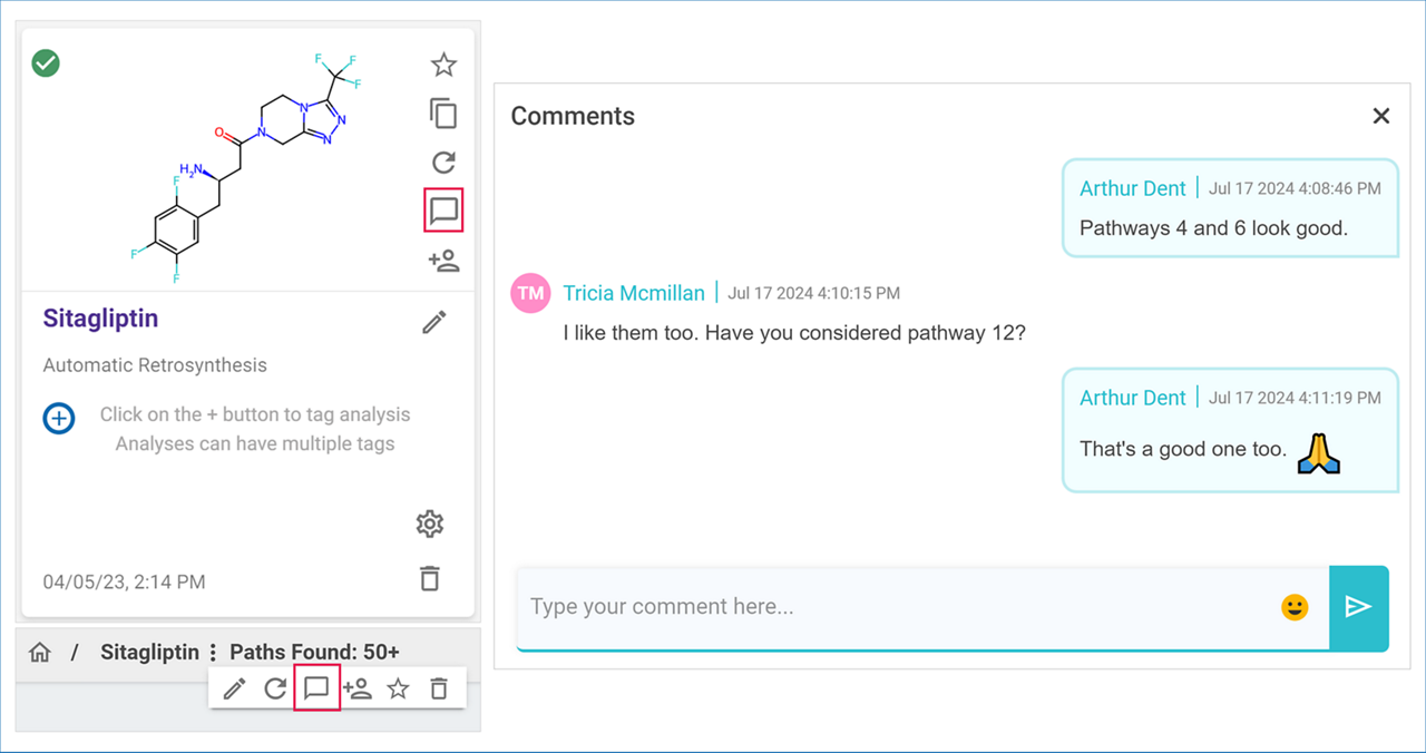 Click the Comment icon on any analysis tile on the homepage dashboard or in the top right corner of the analysis results page to open the comment section.
