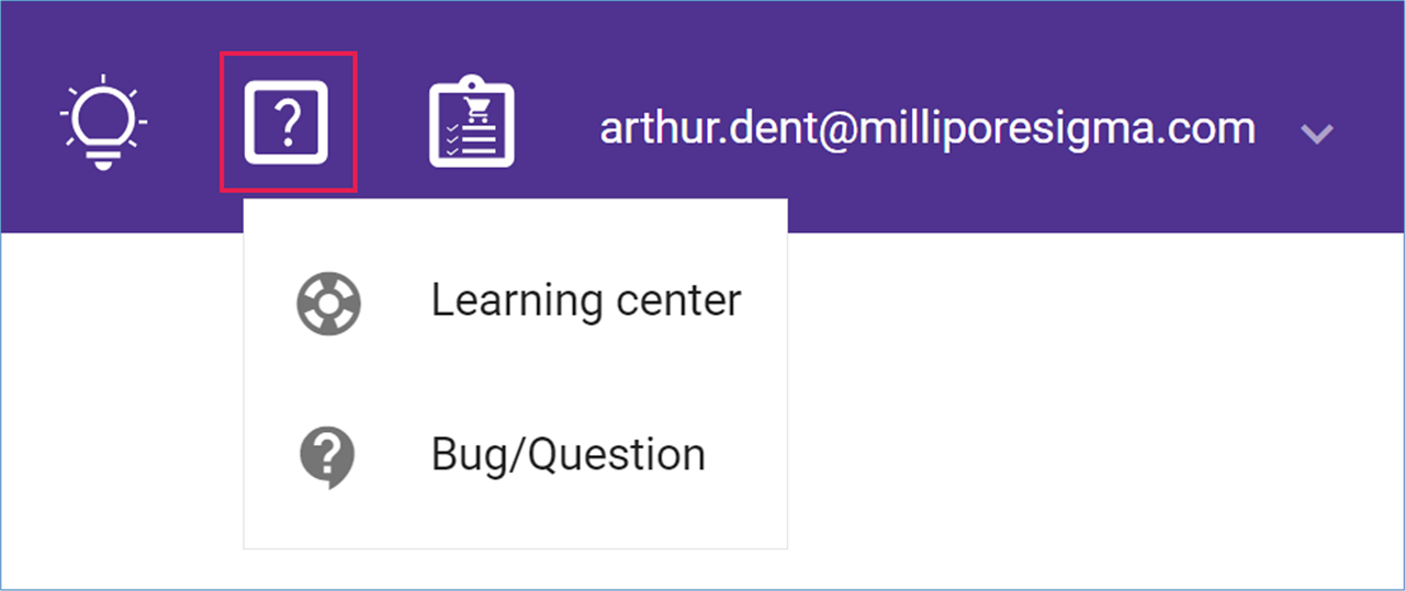 The ‘Help’ menu can be found in the SYNTHIA™ application header, next to the ‘Shopping List icon’. Open the menu to access the Learning Center or the technical support form.
