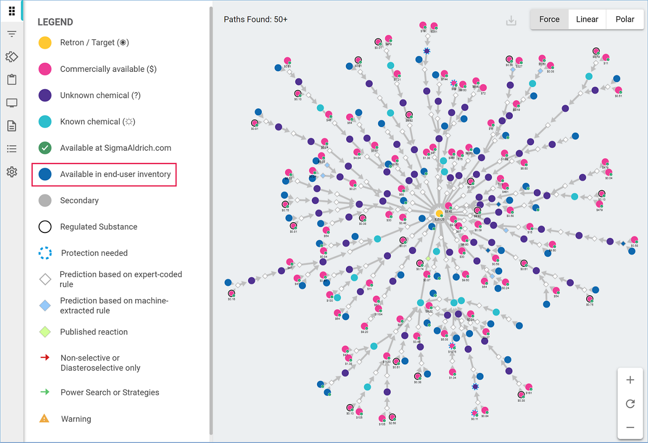 Compounds from a custom inventory are identified as dark blue nodes. Compounds that also belong to the Sigma-Aldrich® catalog will display a green checkmark.