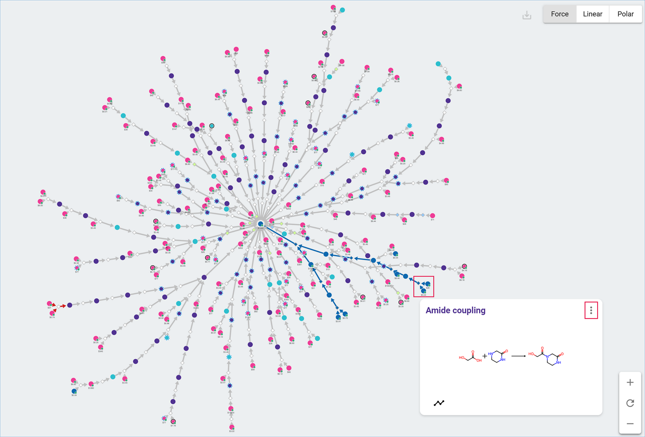 Hover over or click any molecule or reaction node to highlight the pathway it belongs to and open a pop-up window showing the molecule structure or reaction scheme, respectively. The pop-up window allows you to access the reaction or molecule card. (See “Molecule Cards” or “Reaction Cards” for more details.)