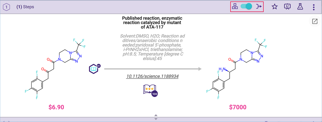 Each pathway is presented as a reaction scheme from starting materials to target compound. The reaction name and typical conditions are shown above each reaction arrow. Links for references are displayed under the reaction arrow for reactions originated from published reaction databases. Price per gram is displayed below the structure of commercially available compounds.