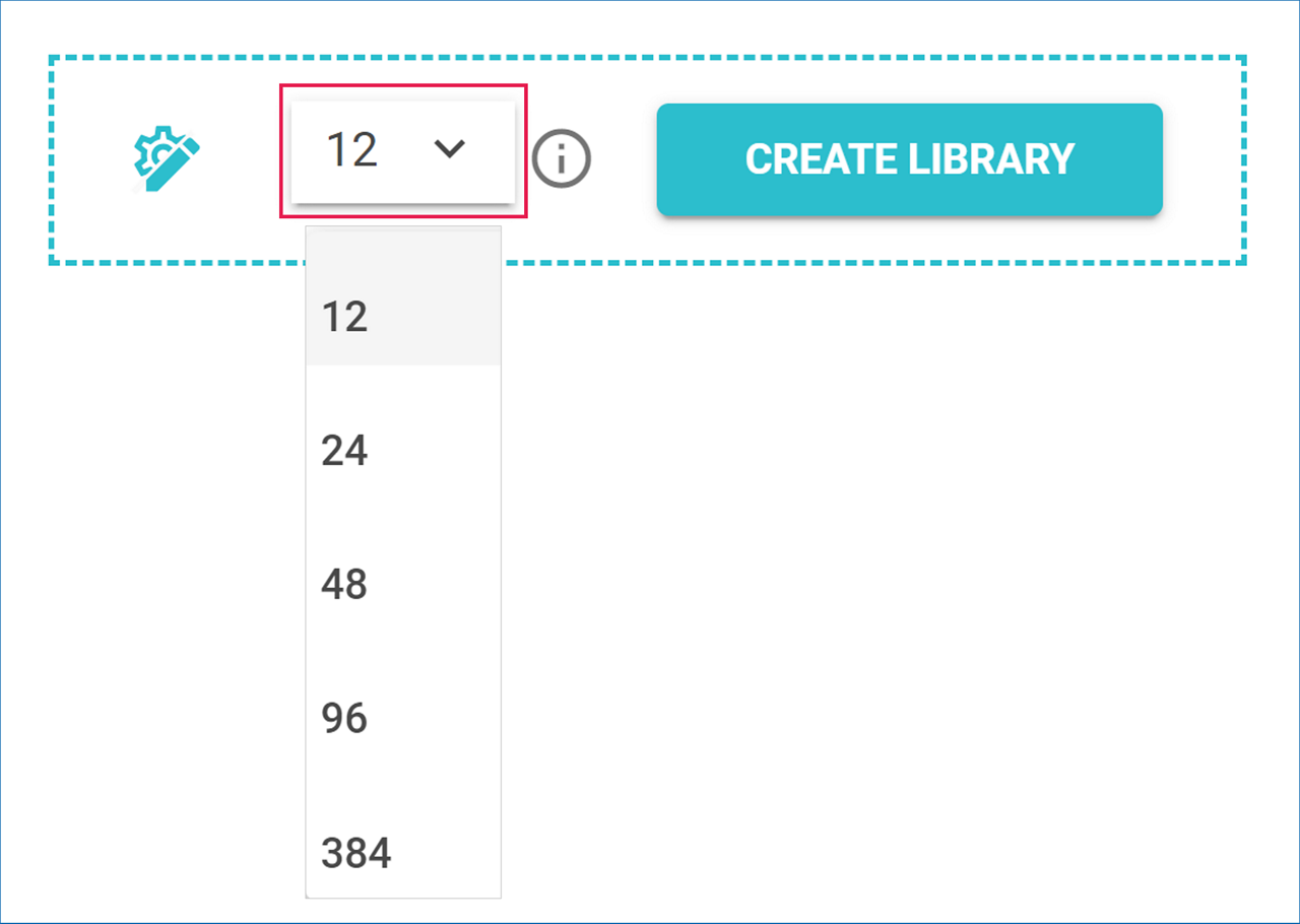 Select the maximum number of compounds you would like to include in your library by clicking on the 'Library Size' dropdown menu. The default value is 12, and the numbers in the list are presented in a geometric sequence from 12 to 384.