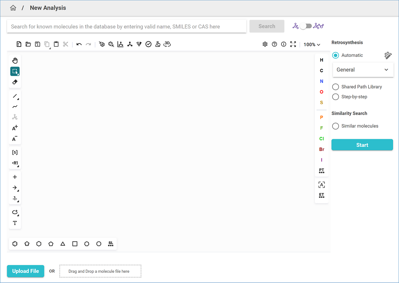 This will open the analysis setup page, where you can select a target molecule, choose the type of analysis you wish to run and customize your search criteria.