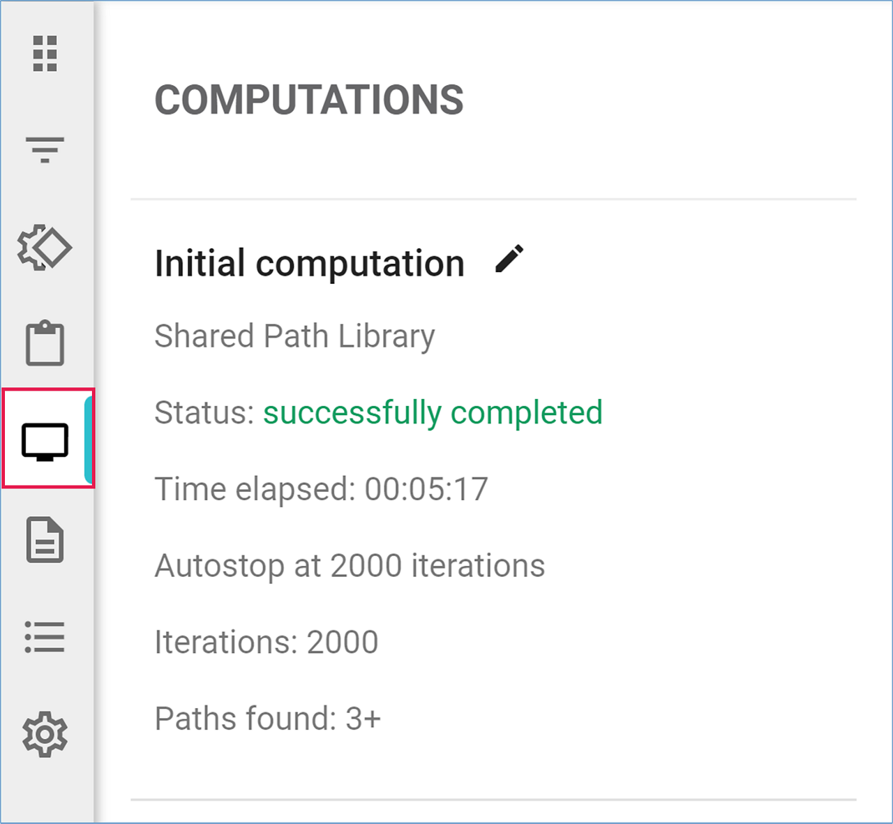 You can monitor the progression of the analysis in the Computations panel. Click on the ‘Computations’ icon to open the panel, where you can view the number of iterations, the number of pathways found, and the time elapsed.