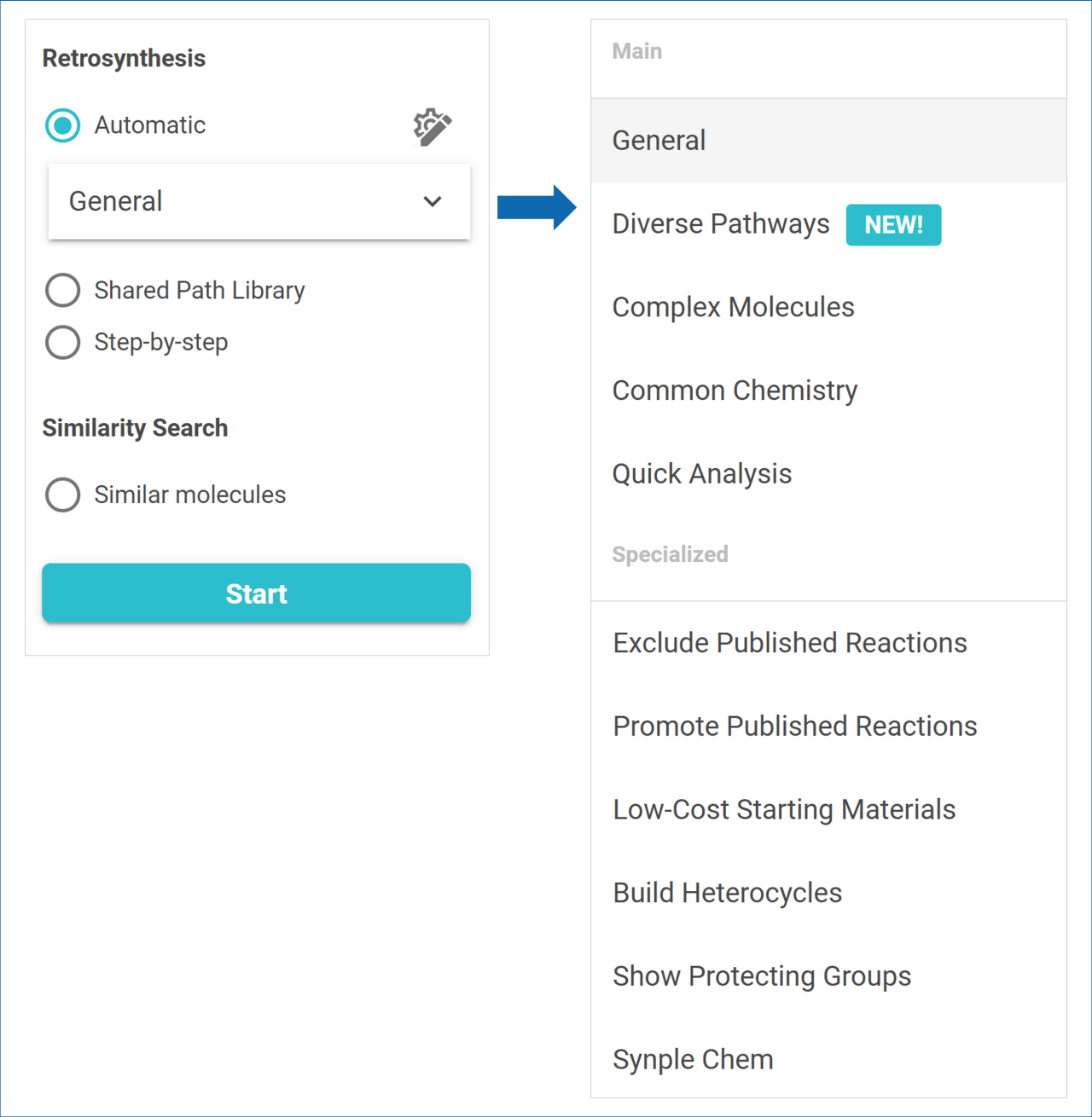 Once you’ve selected a set of Saved Configurations that fit your search, click Start Analysis to let SYNTHIA™ find diverse pathways for your target molecule.