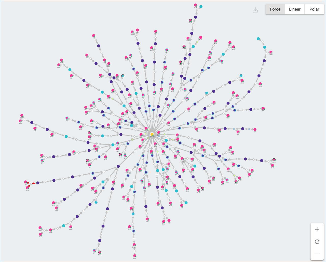 There are three distinct ways to view the graph of pathways: Force, Linear, and Polar.